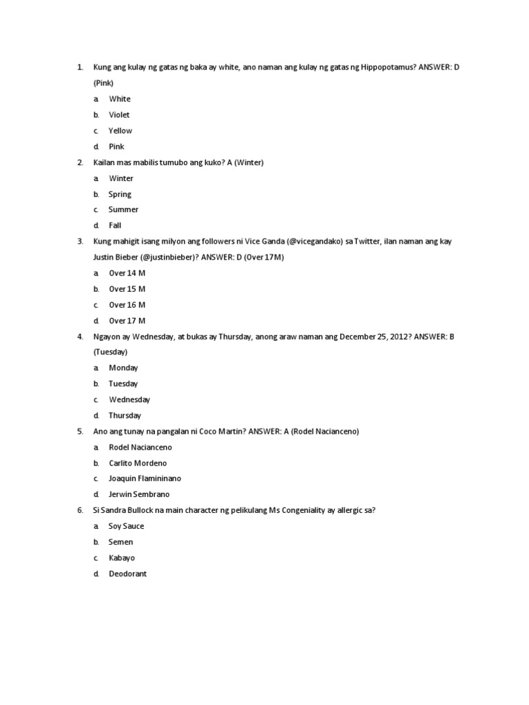The original version of the game started with 50 players answering a series of multiple choice questions (a, b, c, or d), hoping to eliminate all others until . These are questions and actual answers of contest participants! When is the philippine independence day? Pud alegre kaayo sa hyy(pera o bayong) last round. For their tko game sa christmas party (is tko like pera o bayong?).